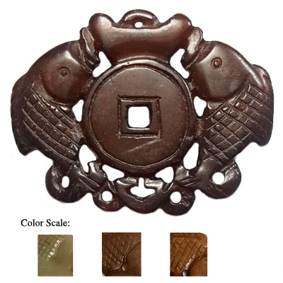 HSIU JADE COUPLE FISHES WITH MONEY COIN 45X60MM BROWN PENDANT