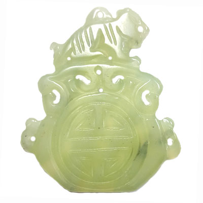 HSIU JADE TIGER WITH LONGEVITY 50X60MM GREEN PENDANT